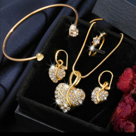 • 4pc Exquisite Silver Heart Diamond Pendant Necklace,  Bracelet,  Crystal Earrings,  Ring Jewellery Set