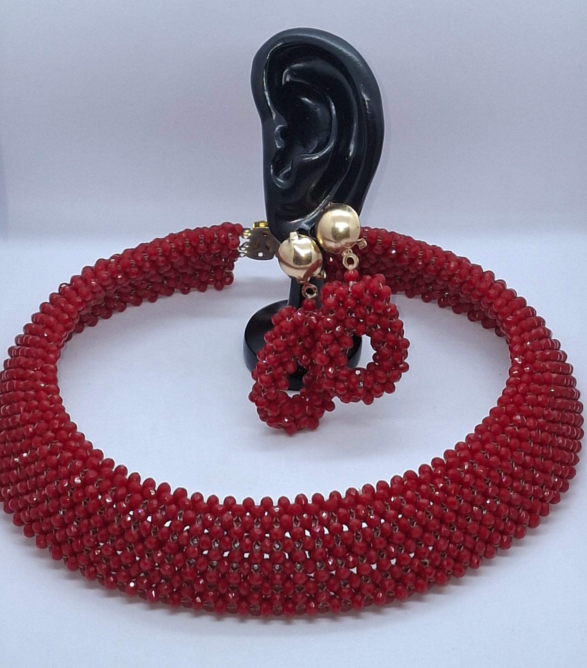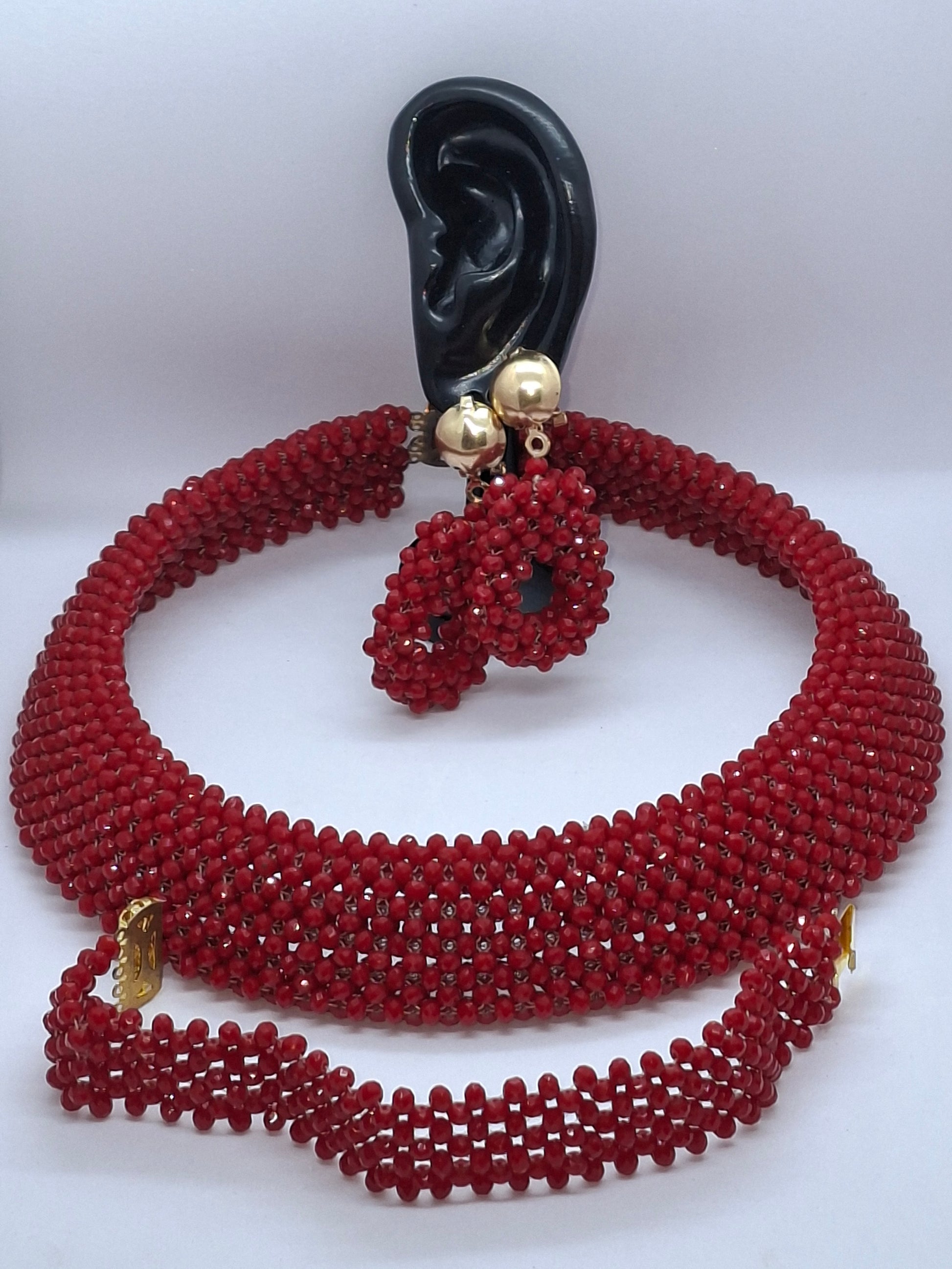 A bold and elegant ruby-red luxury beaded necklace set, handcrafted to perfection. This full, rounded multi-layer design sits beautifully on the neckline and comes with a matching woven bracelet and stylish drop earrings — the perfect statement piece for special occasions, weddings, celebrations and luxury gifting.