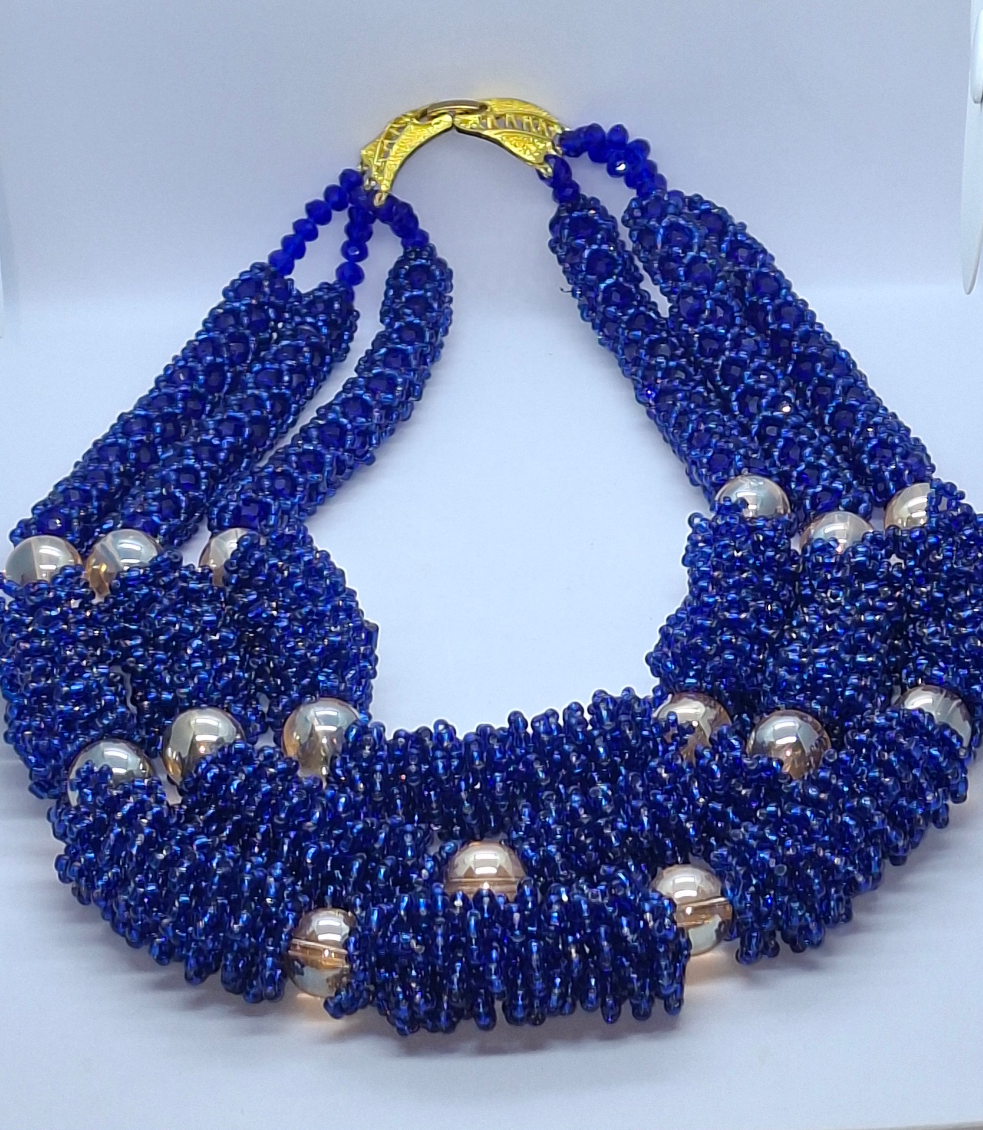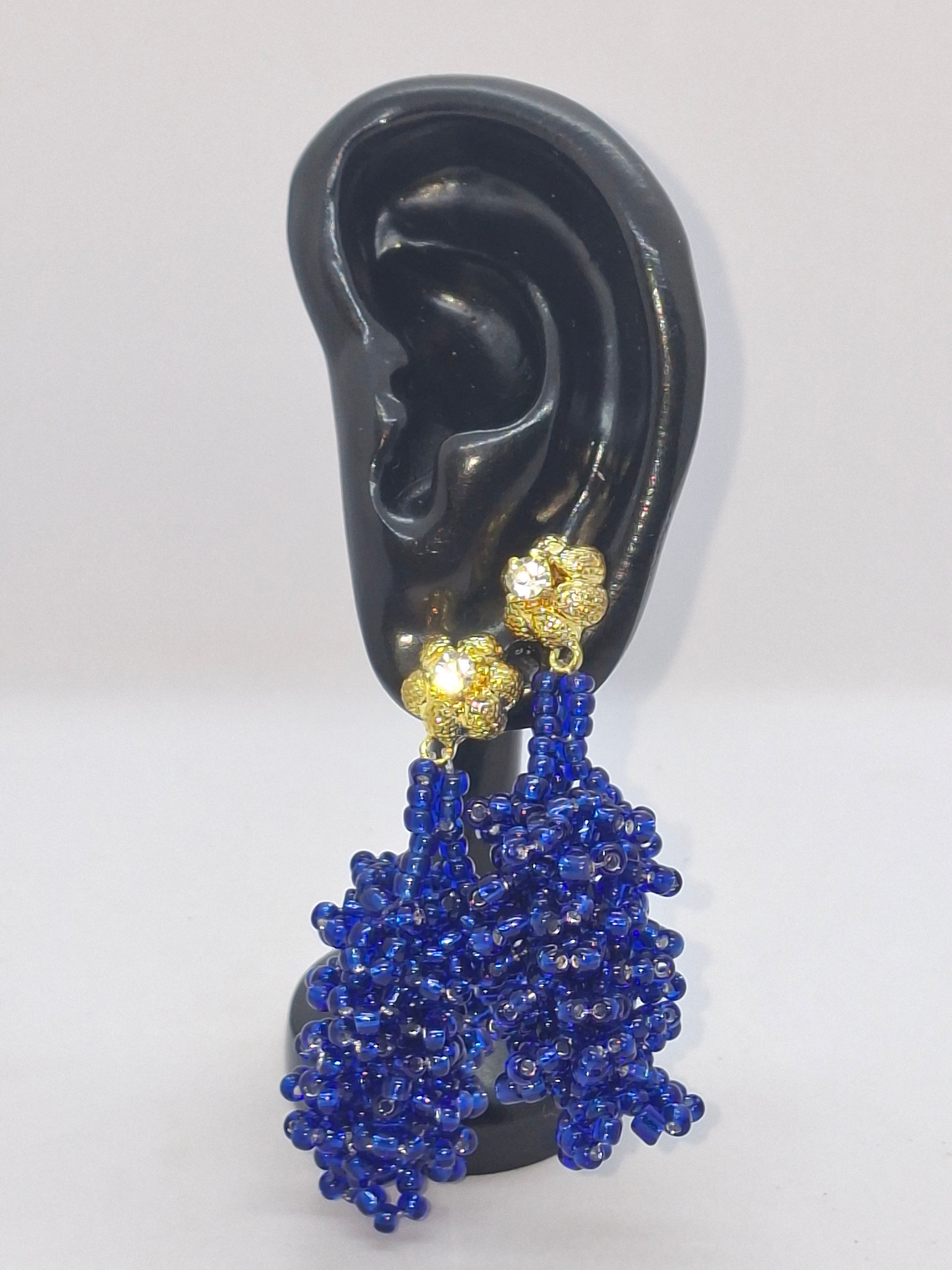 A bold and luxurious royal blue clustered beaded necklace set featuring shimmering seed beads beautifully paired with gold accent balls for a premium, modern look. This handcrafted statement set includes a matching bracelet and elegant drop earrings — the perfect choice for weddings, engagements, receptions, traditional attire and premium gifting.