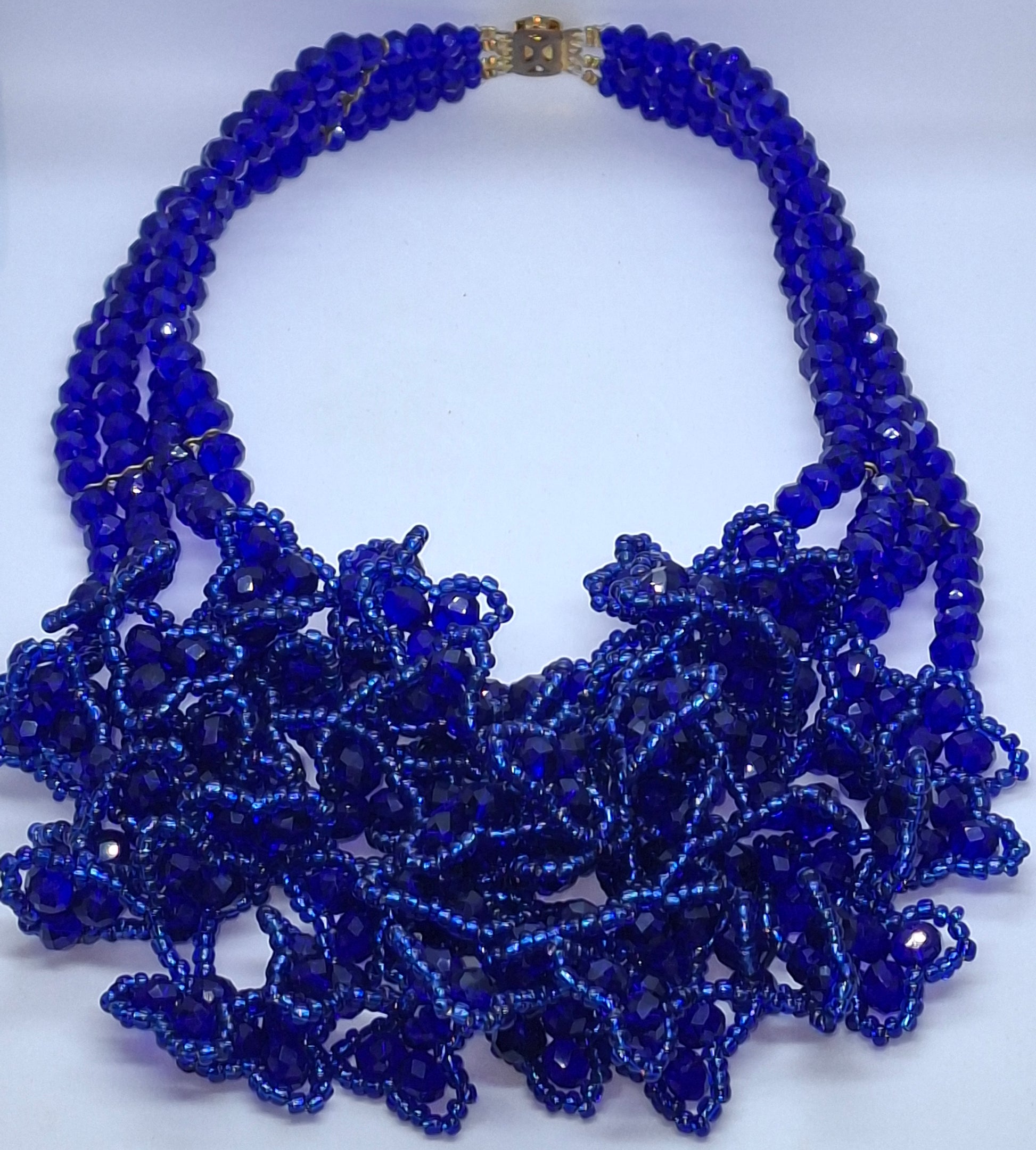 A breathtaking royal-blue luxury beaded set featuring an intricate floral-cluster necklace, handcrafted with hundreds of sparkling faceted beads. This statement design includes a matching bracelet and stunning drop earrings, perfect for weddings, parties, traditional wear and premium gifting.